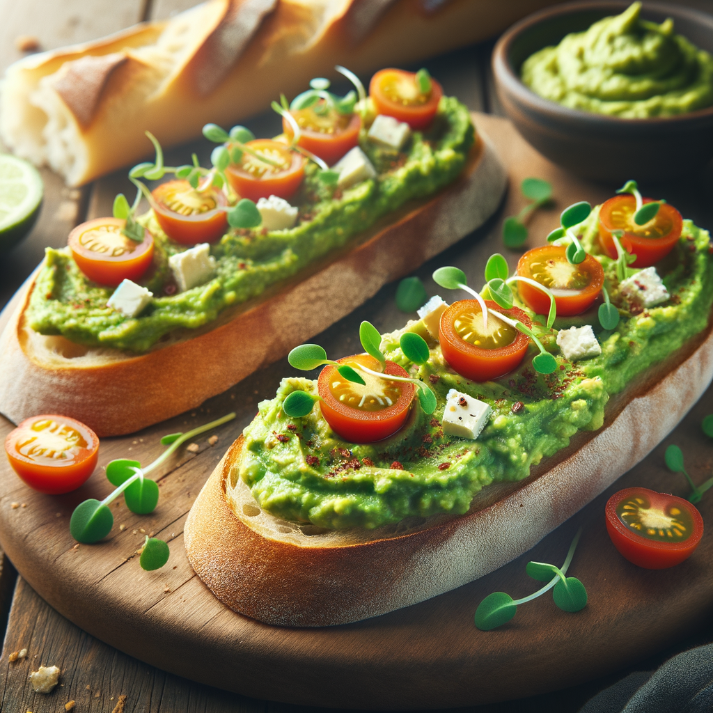 Sliced baguette toasted to perfection, topped with a generous layer of smooth guacamole, cherry tomatoes, and a sprinkle of feta cheese, garnished with microgreens for a sophisticated appetizer.