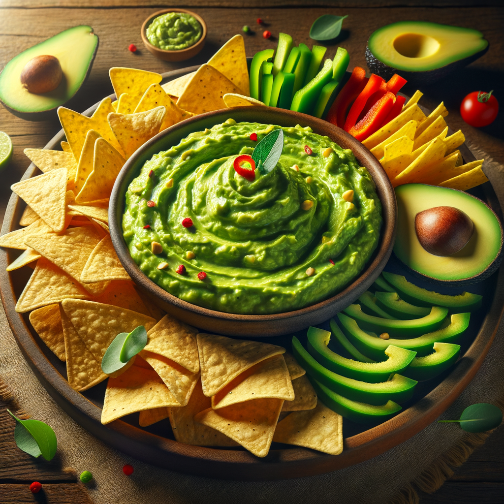 A centerpiece of rich, creamy avocado dip surrounded by an array of dippers such as crispy tortilla chips, jicama sticks, and bell pepper slices for a fun and interactive sharing dish.