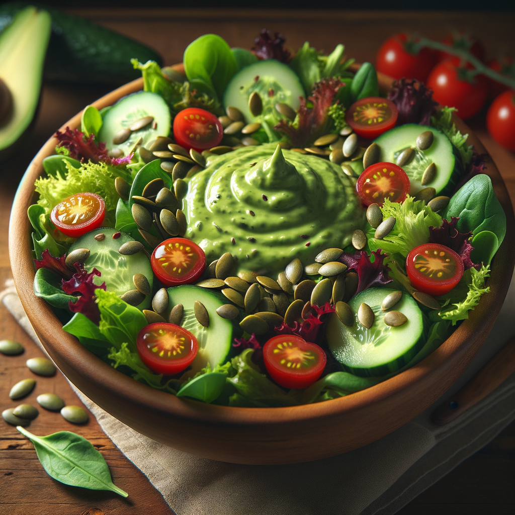A fresh medley of mixed greens, sliced cucumbers, and cherry tomatoes, drizzled with a creamy avocado dressing, topped with toasted pumpkin seeds for a delightful and healthy option.