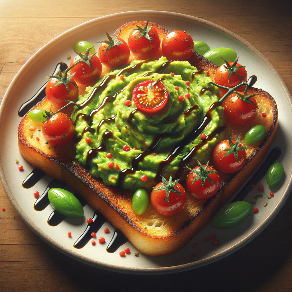 Crispy Italian bread topped with a vibrant green guacamole spread, cherry tomatoes, and a drizzle of balsamic glaze for a refreshing twist on a classic bruschetta.