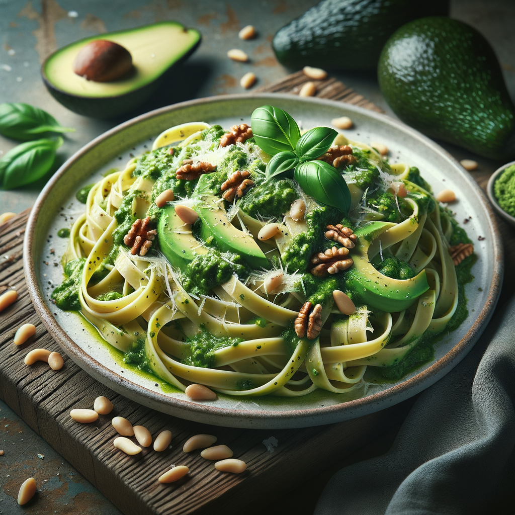 Handmade tagliatelle tossed in a creamy avocado and basil pesto, garnished with pine nuts and grated Parmesan cheese for a modern Italian delight.