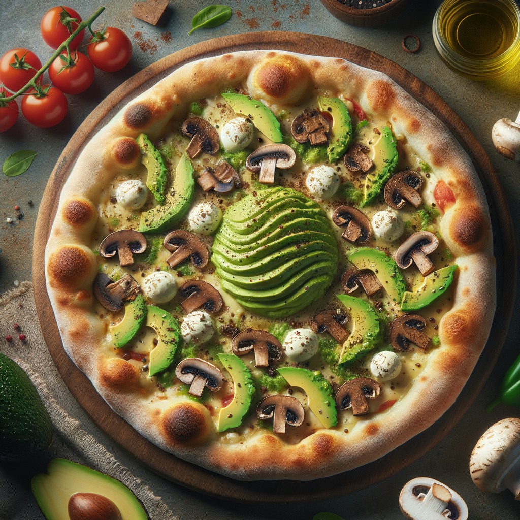 Thin-crust pizza topped with a smooth avocado spread, truffle oil, wild mushrooms, and mozzarella cheese, creating a luxurious gourmet experience.