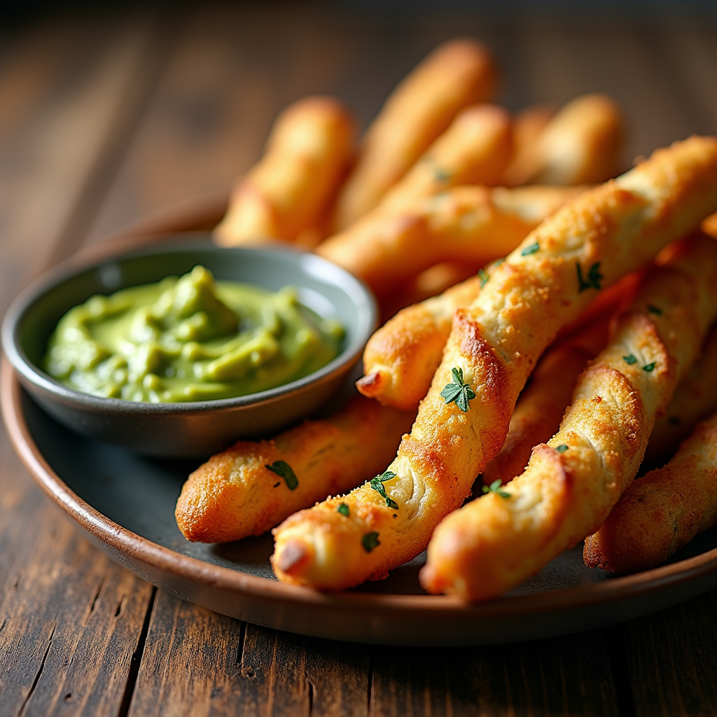 Crispy Sicilian-style breadsticks served with a side of chunky guacamole. The breadsticks are seasoned with herbs and spices, offering a savory complement to the cool and creamy dip.