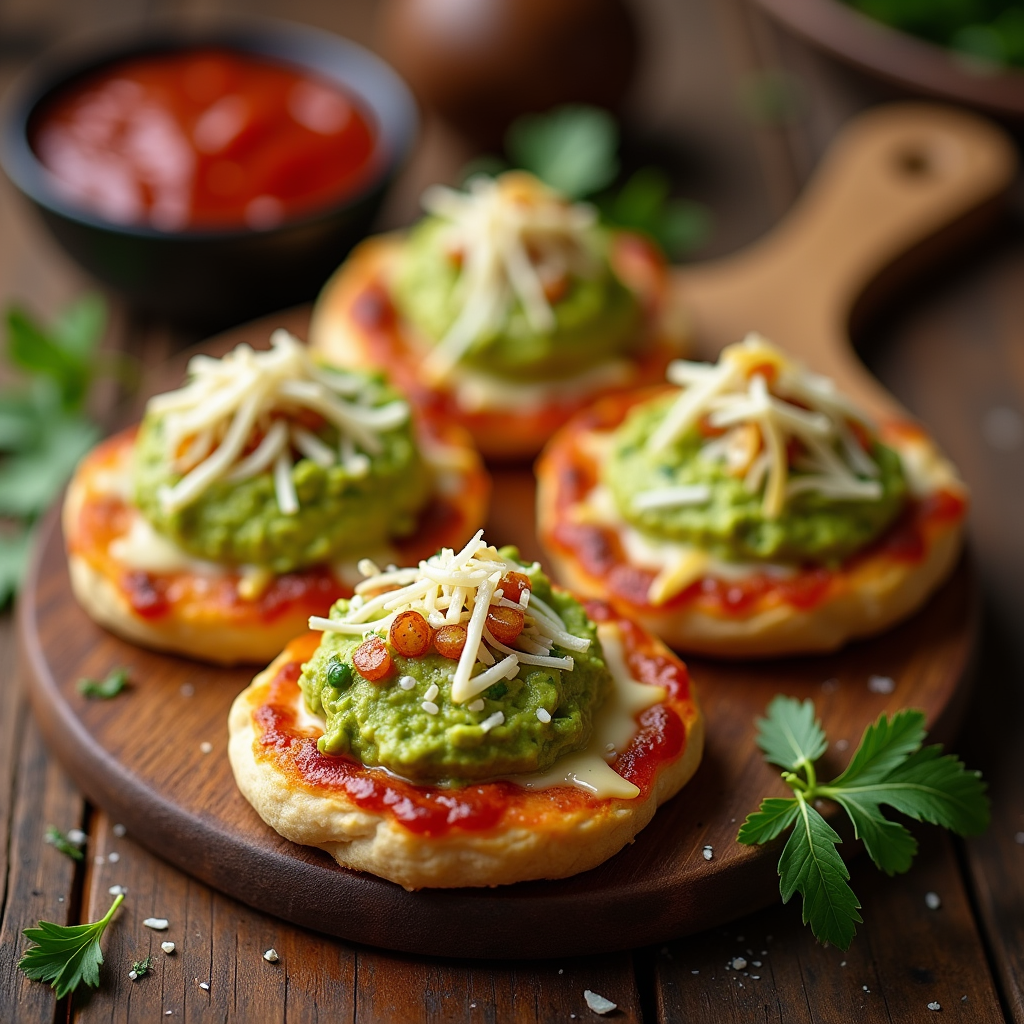 Miniature pizza pockets, filled with creamy guacamole and melted mozzarella. Topped with a sprinkle of Parmesan and a side of marinara for dipping. A delightful fusion of flavors.