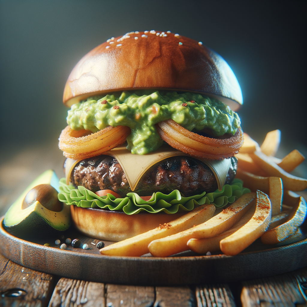 A succulent grilled beef patty topped with a generous layer of zesty guacamole, melted pepper jack cheese, and crispy onion rings, all served on a toasted brioche bun with a side of seasoned fries.
