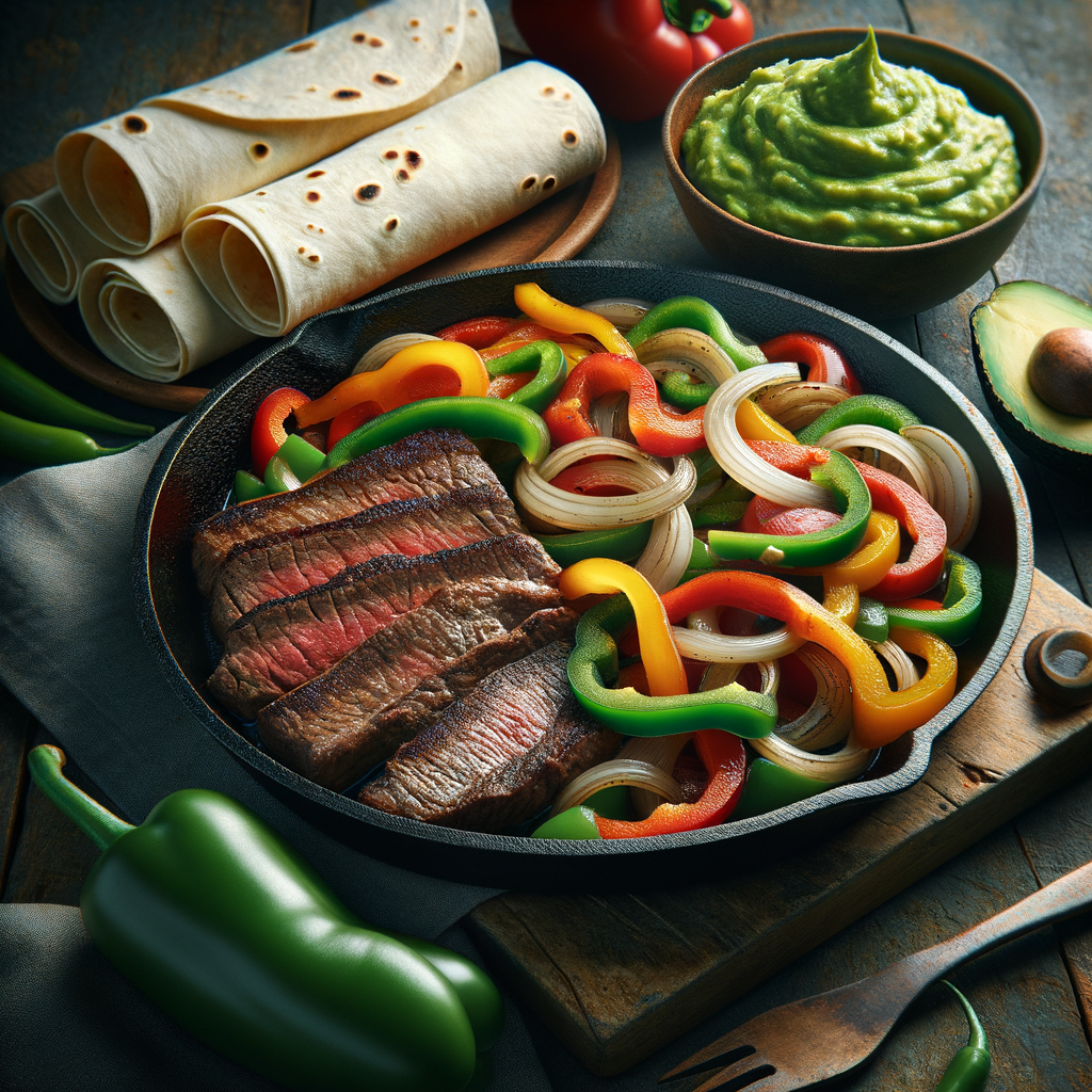 Tender slices of steak sautéed with bell peppers and onions, served on a sizzling skillet with warm tortillas and a side of rich guacamole for spreading or dipping.