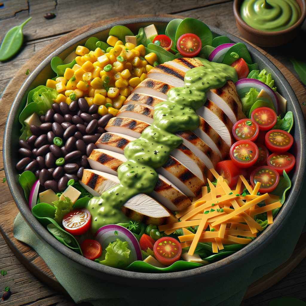 Grilled chicken breast on a bed of fresh mixed greens, tossed with black bean corn salsa, grape tomatoes, and cheddar cheese, drizzled with a creamy avocado dressing and sprinkled with crispy tortilla strips.