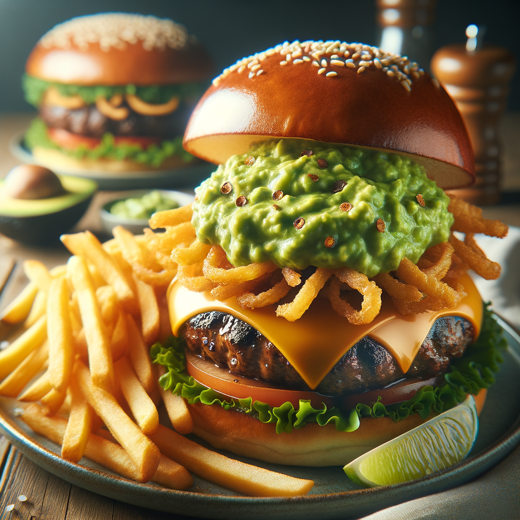 A juicy grilled burger topped with melted pepper jack cheese, crispy onion strings, and a generous dollop of creamy guacamole, served on a toasted brioche bun with a side of golden fries.
