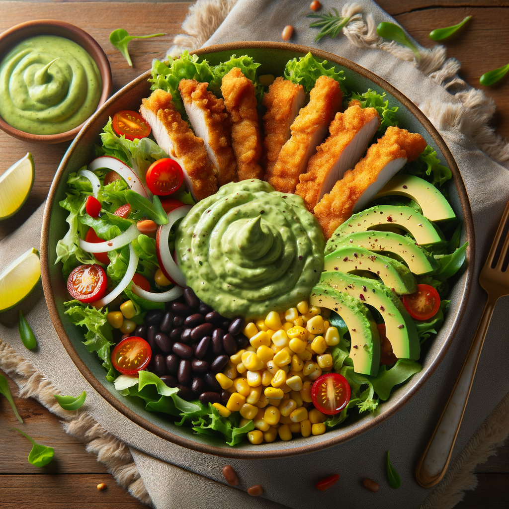 Golden, crispy chicken tenders arranged over a bed of fresh mixed greens, sweet corn, black beans, and cherry tomatoes, all drizzled with a zesty avocado dressing and a sprinkle of shredded cheese.