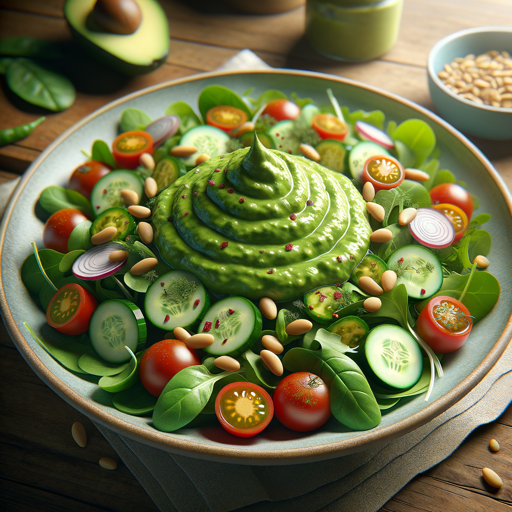 A nourishing blend of organic mixed greens, heirloom cherry tomatoes, and cucumber ribbons, topped with a generous dollop of zesty avocado dressing and sprinkled with toasted pine nuts for an artisanal touch.