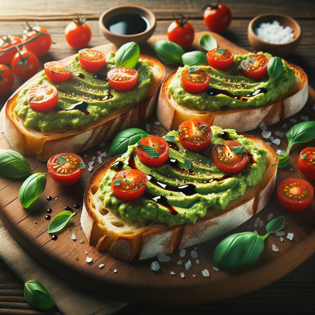 Toasted slices of handcrafted artisanal bread, heaped with ripe cherry tomatoes, basil, and a smear of avocado mash, drizzled with a balsamic glaze and a sprinkle of flaky sea salt.