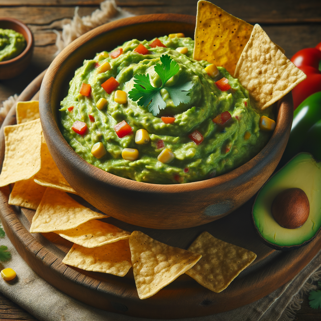 A rustic bowl filled with smooth, freshly prepared guacamole, complemented by roasted sweet corn, diced red bell peppers, and a sprinkle of cilantro, served with homemade corn tortilla chips for dipping.