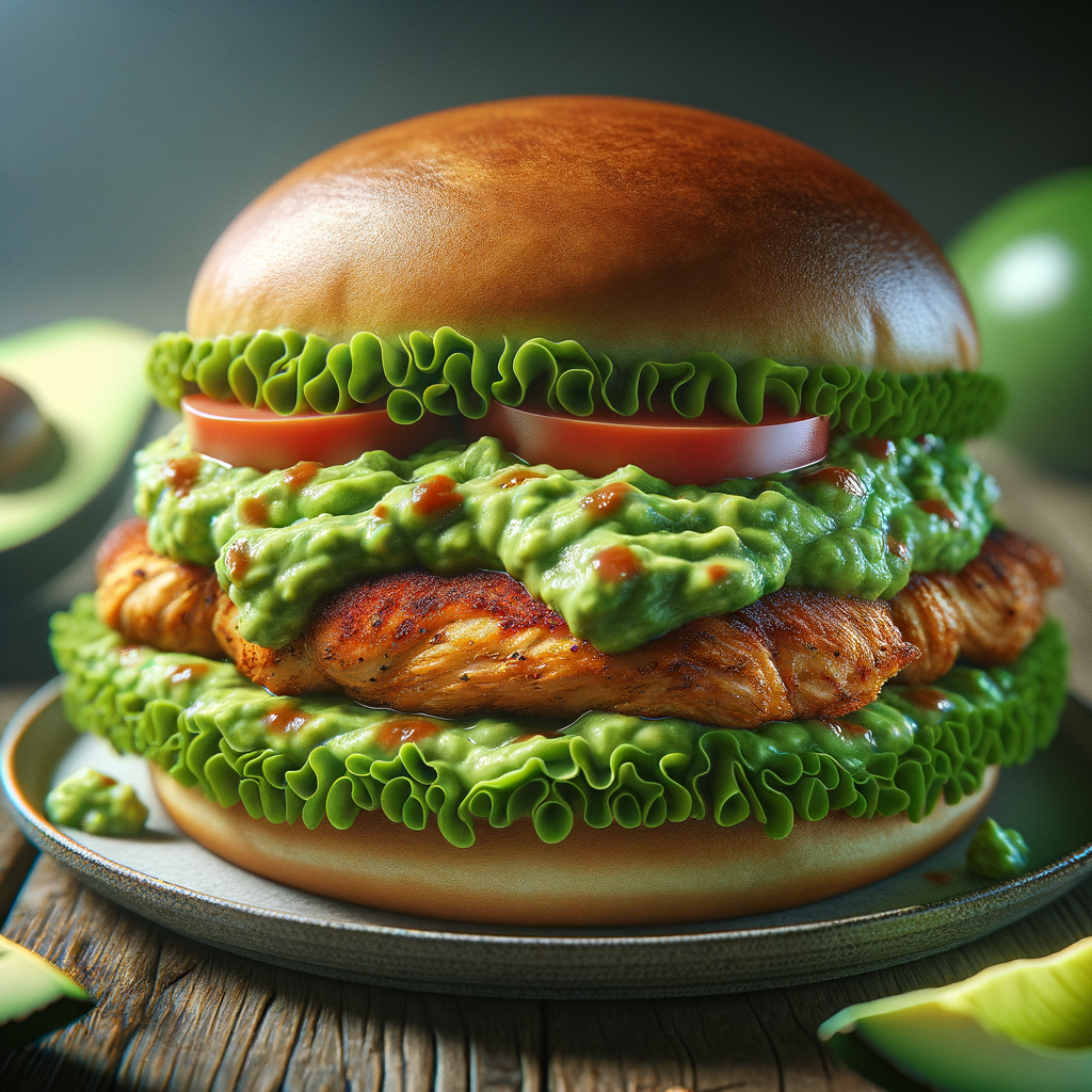 Crispy chicken fillet with spicy guacamole, lettuce, and tomato, served on a toasted bun for a zesty kick.