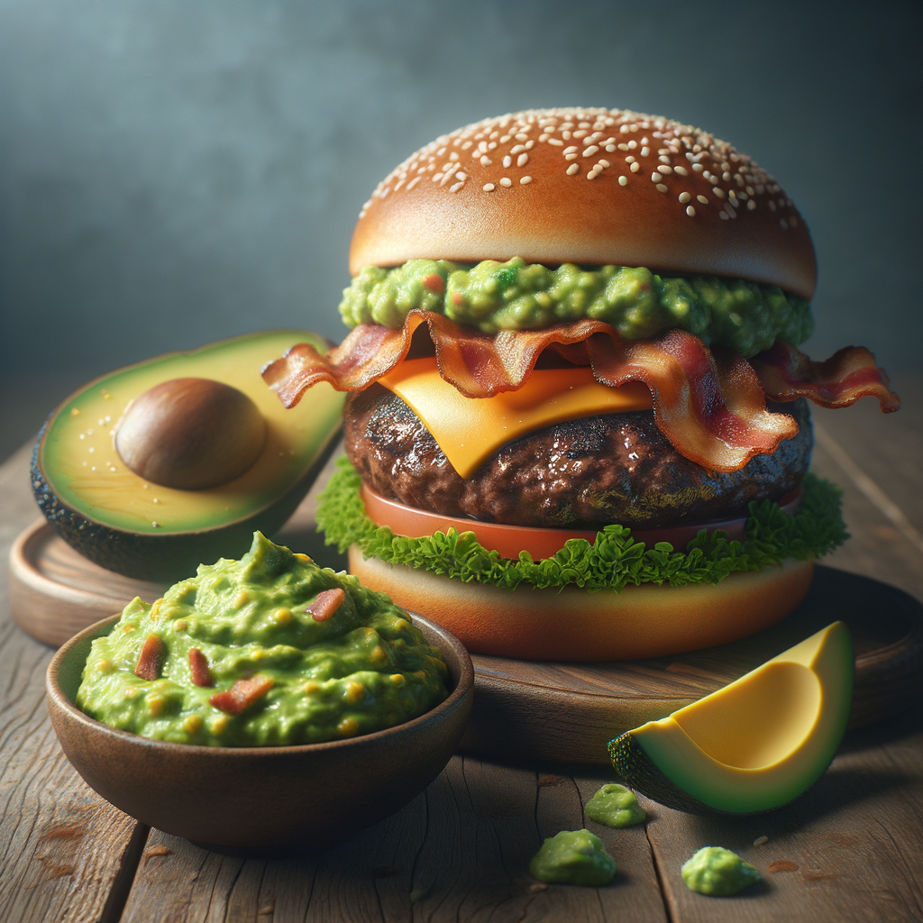 A juicy beef patty topped with crispy bacon, melted cheddar cheese, and a generous layer of creamy guacamole, all sandwiched between a toasted bun.