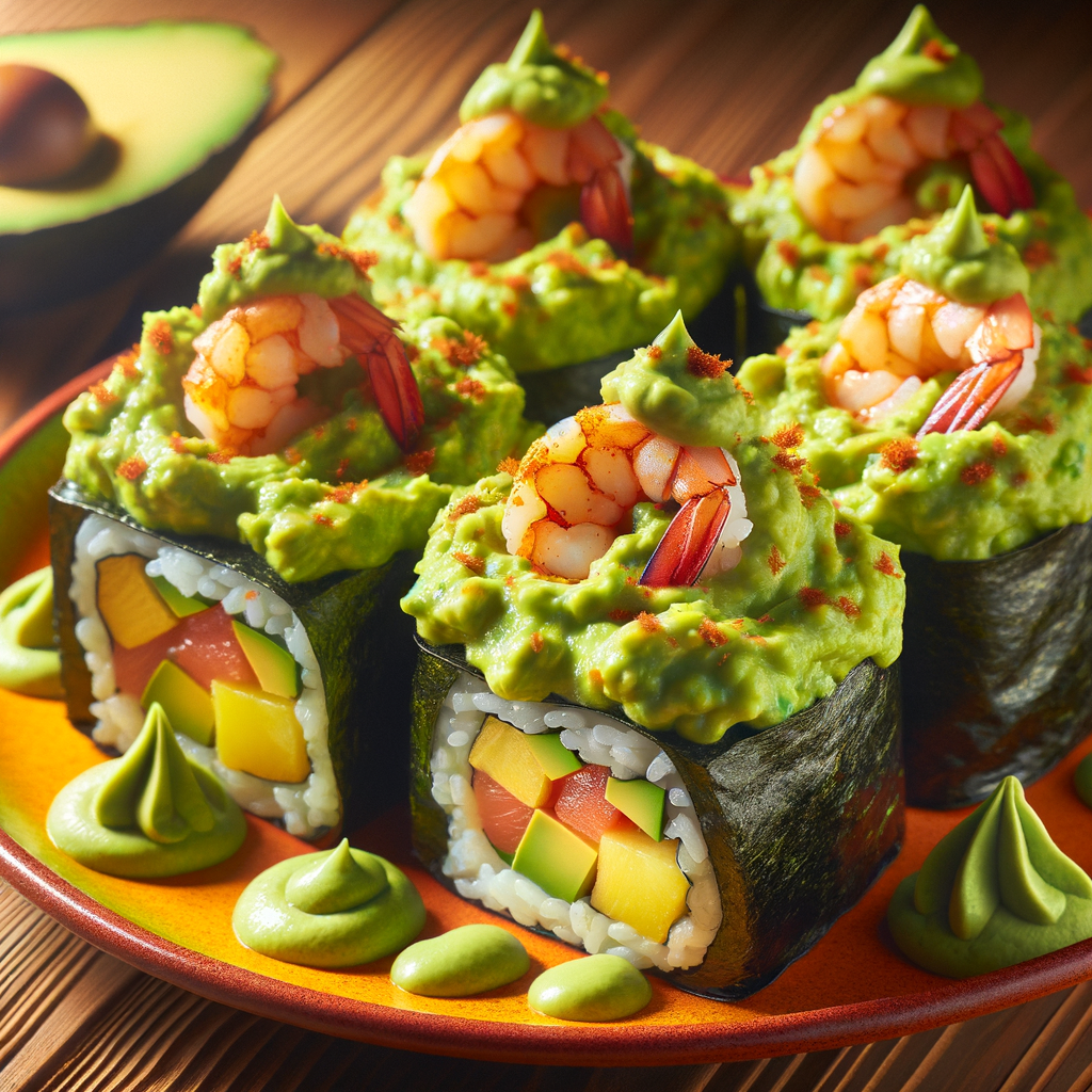 An ingenious roll that marries the sushi concept with Mexican flavors, featuring spicy al pastor-seasoned shrimp, avocado guacamole, and a hint of pineapple, wrapped in nori and sushi rice, topped with a drizzle of avocado-wasabi sauce.