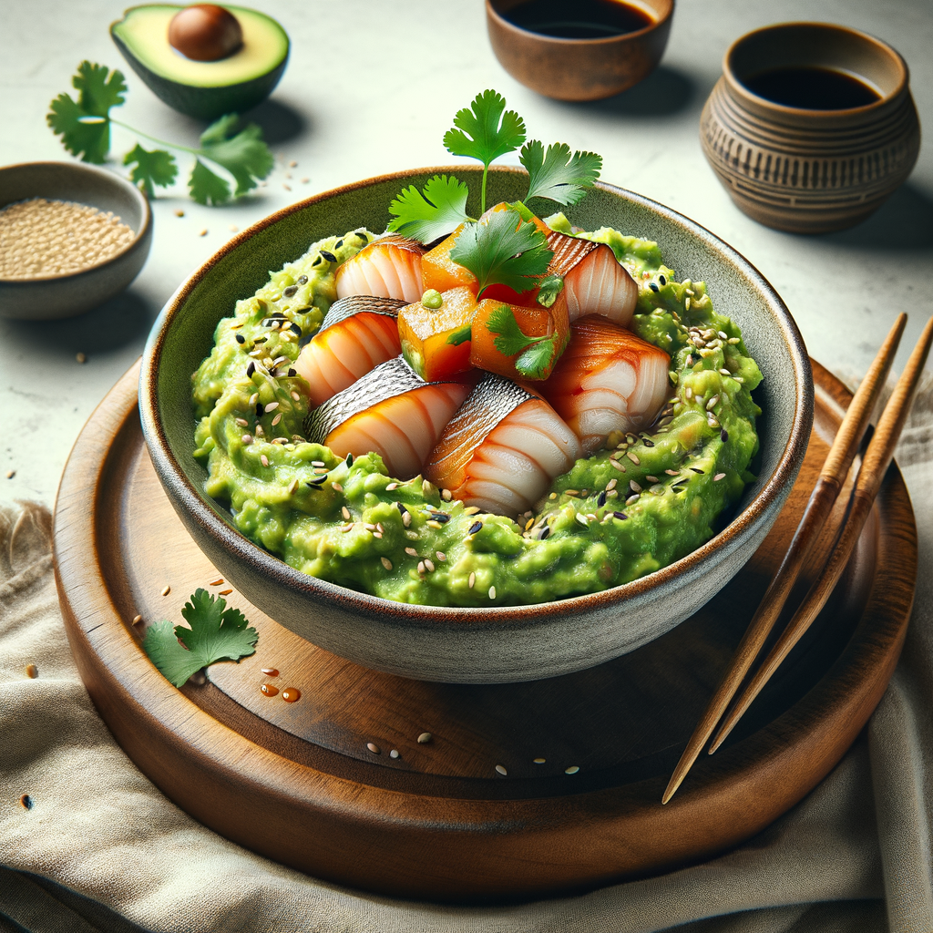 A vibrant fusion of classic Peruvian ceviche and Asian flavors, featuring fresh sea bass marinated in a citrusy soy-guacamole emulsion, garnished with cilantro and toasted sesame seeds.