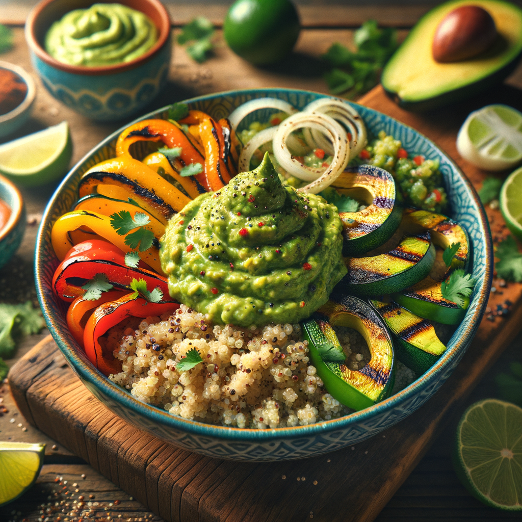A colorful vegan delight with grilled bell peppers, onions, and zucchini, atop a base of quinoa. Finished with a hearty scoop of mash guac, sprinkled with chopped cilantro and served with a side of avocado-lime dressing.
