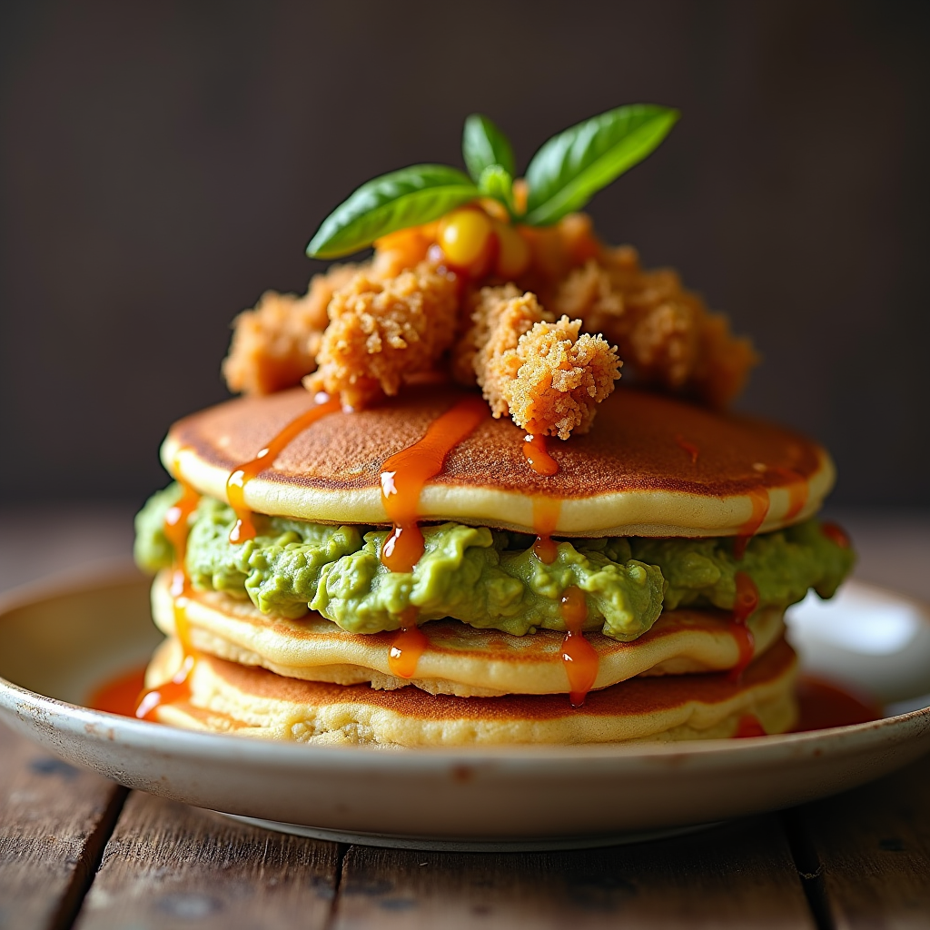 Fluffy pancakes layered with a subtly sweet corn guacamole and topped with crispy fried chicken. A drizzle of honey-chipotle sauce adds a gentle kick.