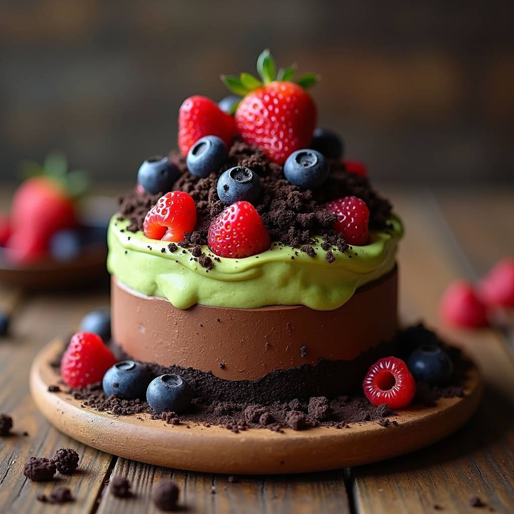 Decadent chocolate mousse layered with a sweet Avocado Dip, crushed Oreo 'dirt', and fresh berries. A surprisingly delicious and visually contrasting treat.