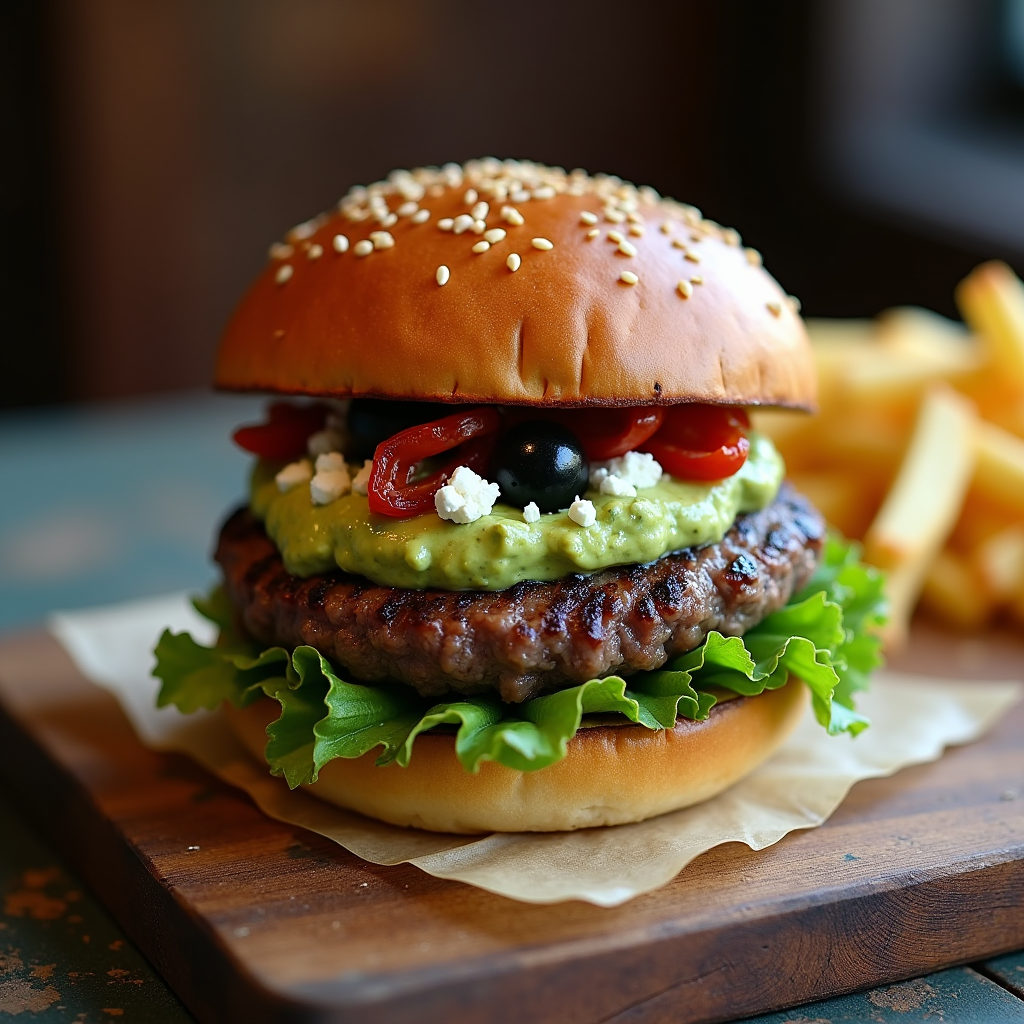 Grilled beef patty topped with creamy Mediterranean-spiced Mash Guac, crumbled feta, Kalamata olives, and sun-dried tomatoes on a toasted brioche bun. Fresh and savory.