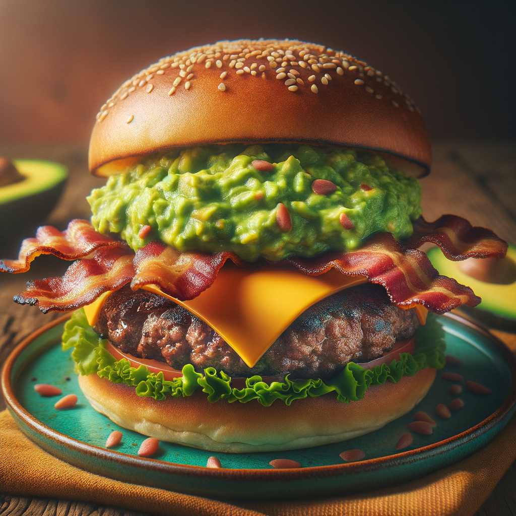 Juicy beef patty topped with a generous layer of guacamole, crispy bacon, and melted cheddar cheese, served on a toasted bun.