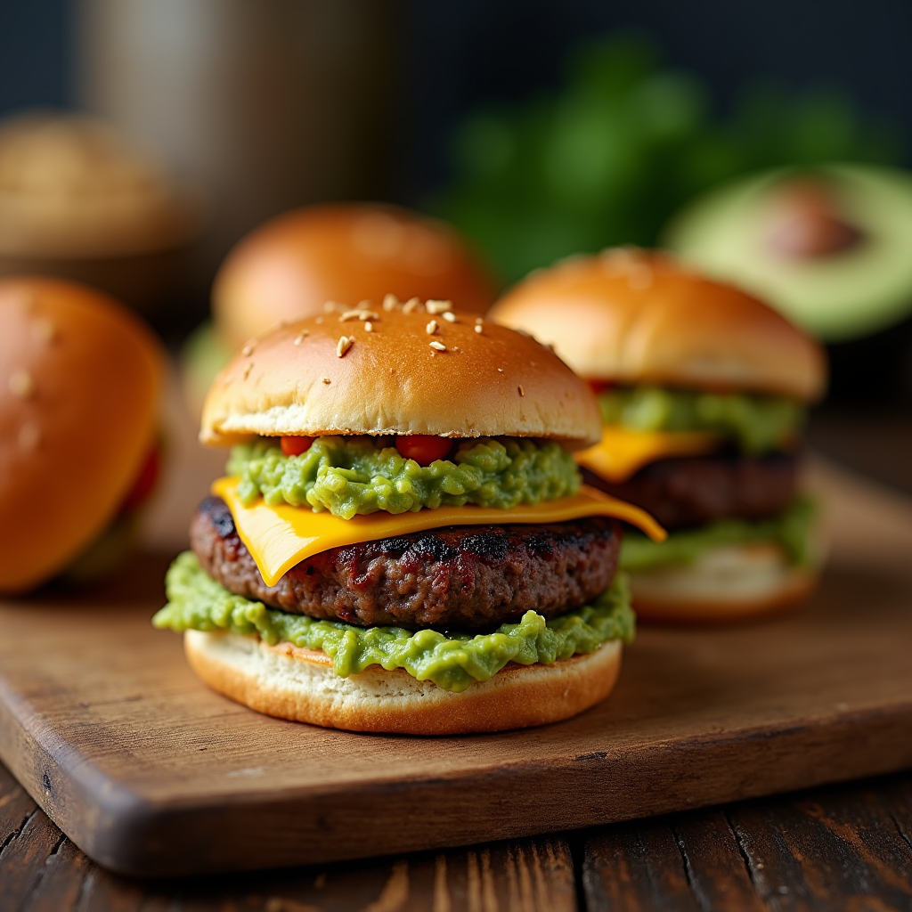 Miniature burgers with a kick! Juicy beef patties nestled in toasted buns, topped with melted pepper jack cheese and a fiery, chunky guacamole. A burst of flavor in every bite.