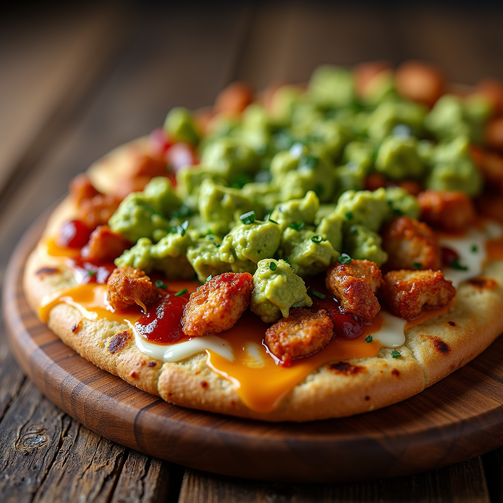 Crispy flatbread topped with smoky BBQ chicken, melted cheese, and a vibrant, creamy guacamole. A sweet and savory explosion with a refreshing avocado finish.