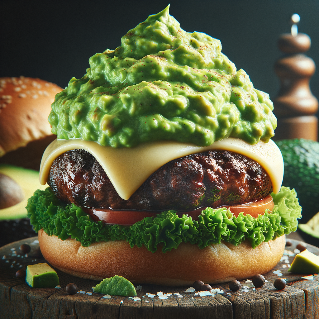 A hearty beef burger topped with melted cheese, crispy lettuce, and a generous dollop of rich avocado mash. The guacamole adds a creamy, refreshing layer to the savory burger.