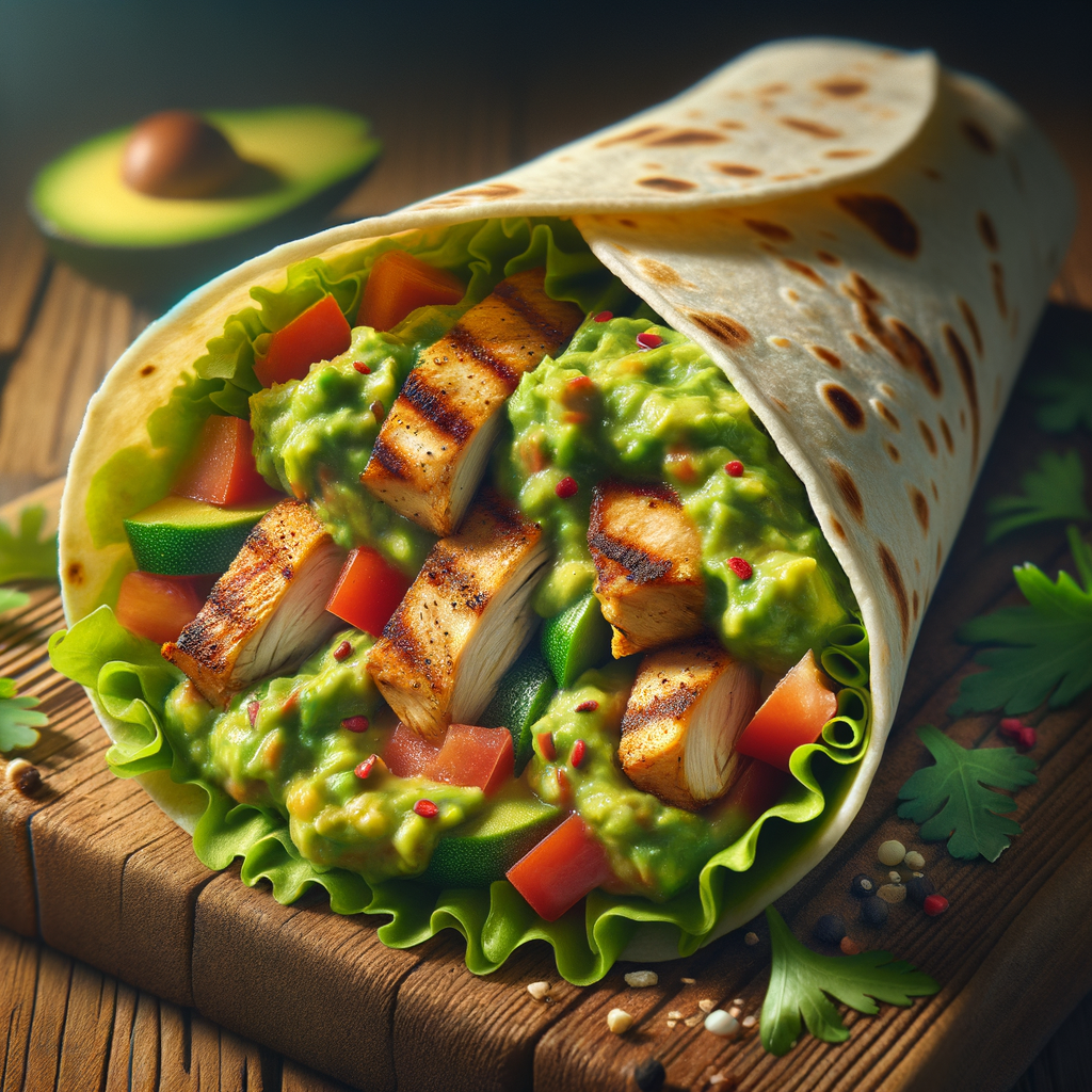 A soft tortilla wrap filled with grilled chicken strips, spicy guacamole, fresh veggies, and a drizzle of tangy sauce. The guacamole's creaminess perfectly balances the heat and adds a burst of flavor.