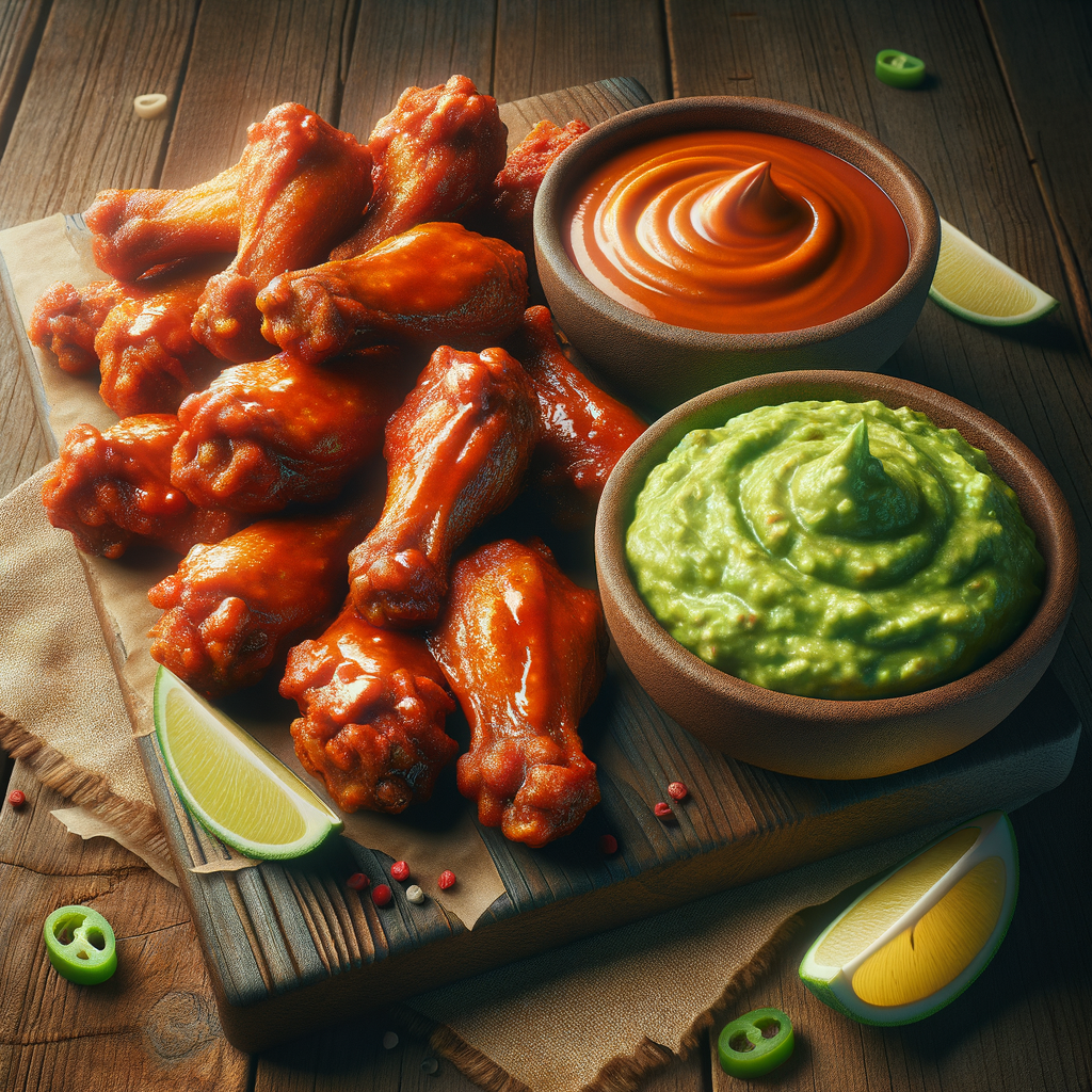 Crispy fried chicken wings smothered in a bold Buffalo sauce, served with a side of smooth guacamole for dipping. The guacamole adds a creamy contrast to the spicy kick of the wings.