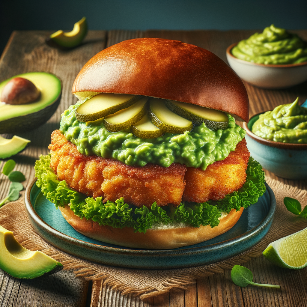 A crispy fish fillet drizzled with a spicy avocado dressing, accompanied by tangy pickles, shredded lettuce, and a creamy tartar sauce, all encased in a warm, toasted brioche bun.