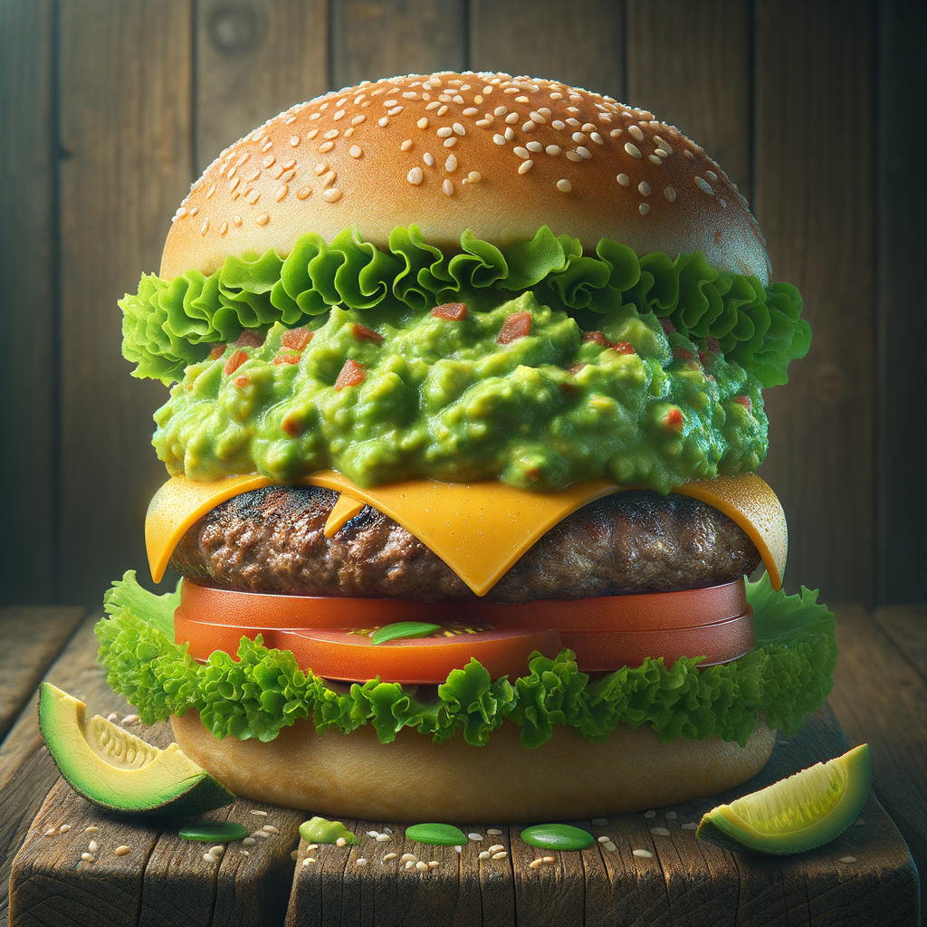A flame-grilled beef patty topped with a generous dollop of zesty guacamole, melted cheddar cheese, crisp lettuce, and ripe tomato slices, all nestled between a soft sesame seed bun.