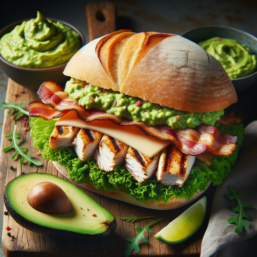 A tender grilled chicken fillet sandwich featuring a slather of avocado dip, topped with bacon strips, a slice of Swiss cheese, and fresh garden greens, served on a toasted artisan bun.