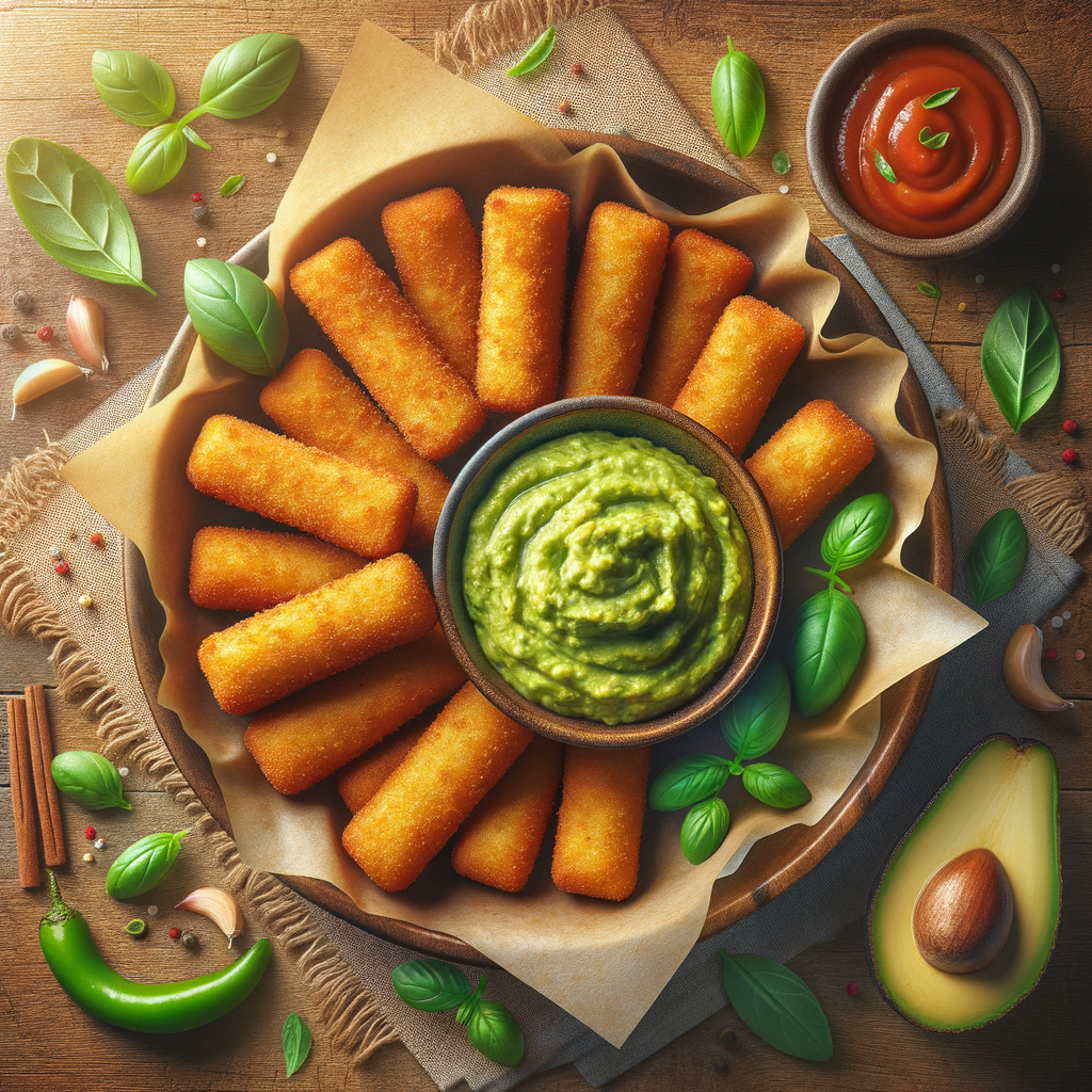 Crispy mozzarella sticks served with a side of zesty guacamole for dipping, adding a creamy twist to a classic favorite.