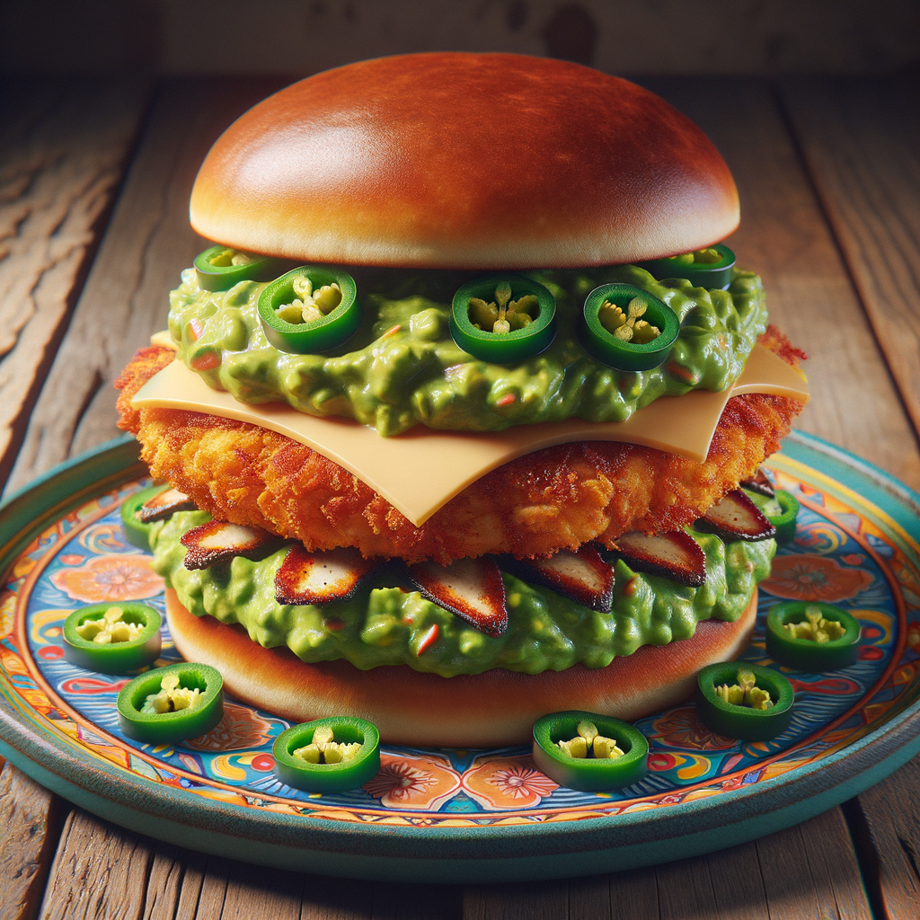 Crispy chicken breast layered with smooth avocado mash, pepper jack cheese, and spicy jalapeños on a soft brioche bun.