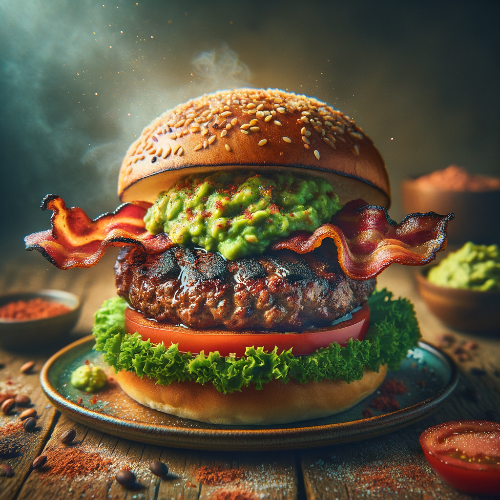 A flame-grilled beef patty topped with creamy guacamole, crispy bacon, fresh lettuce, tomato, and a hint of lime on a toasted sesame seed bun.