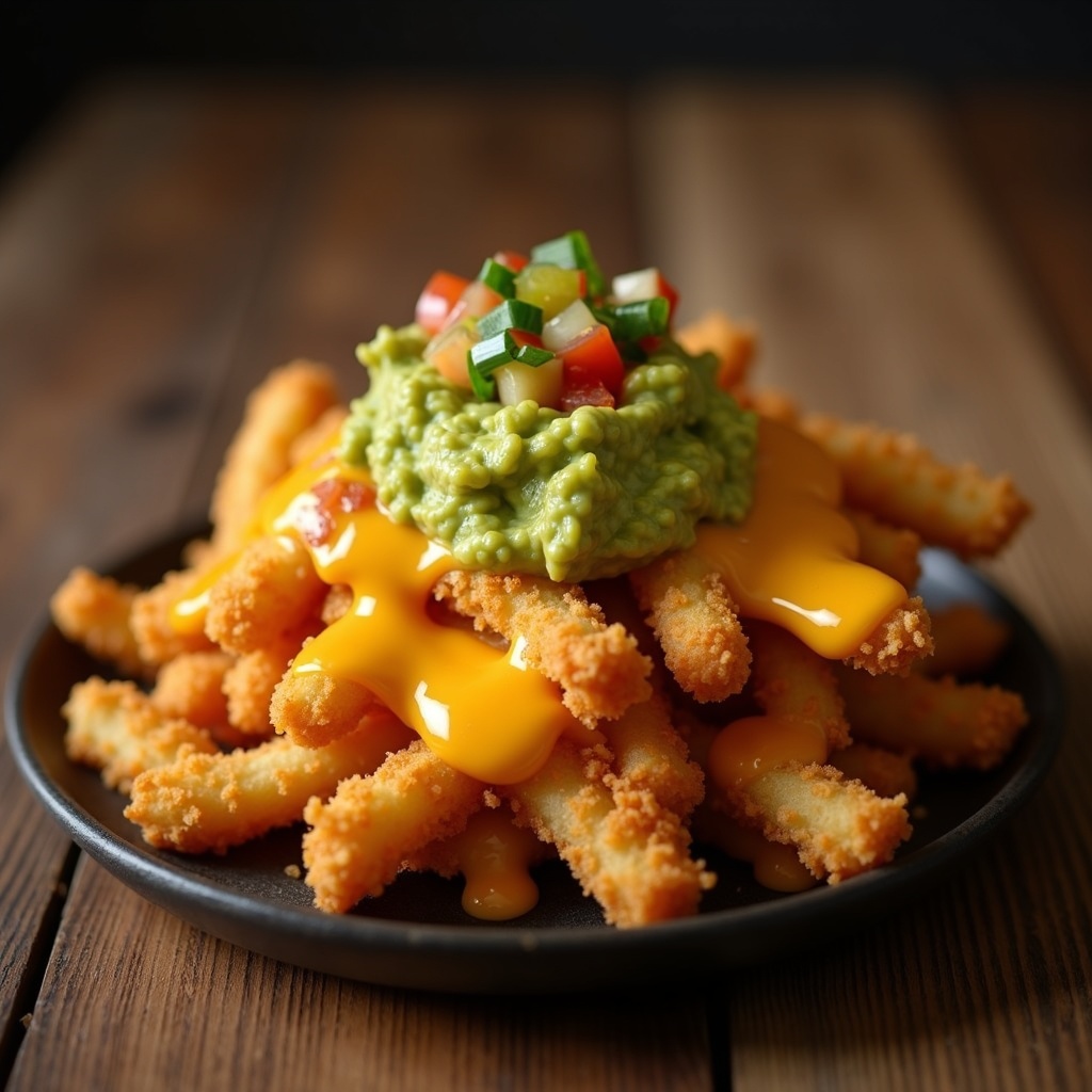 Crispy Chicken Fries covered in nacho cheese sauce, a dollop of vibrant guacamole and sprinkled with pico de gallo. It's crunchy, cheesy, savory and fresh, all in one bite.