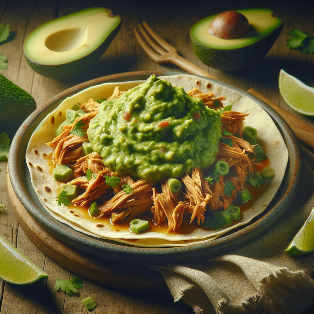 Savory pulled chicken wrapped in a homemade corn tortilla, smothered in a vibrant green tomatillo sauce, and topped with a rich guacamole drizzle.