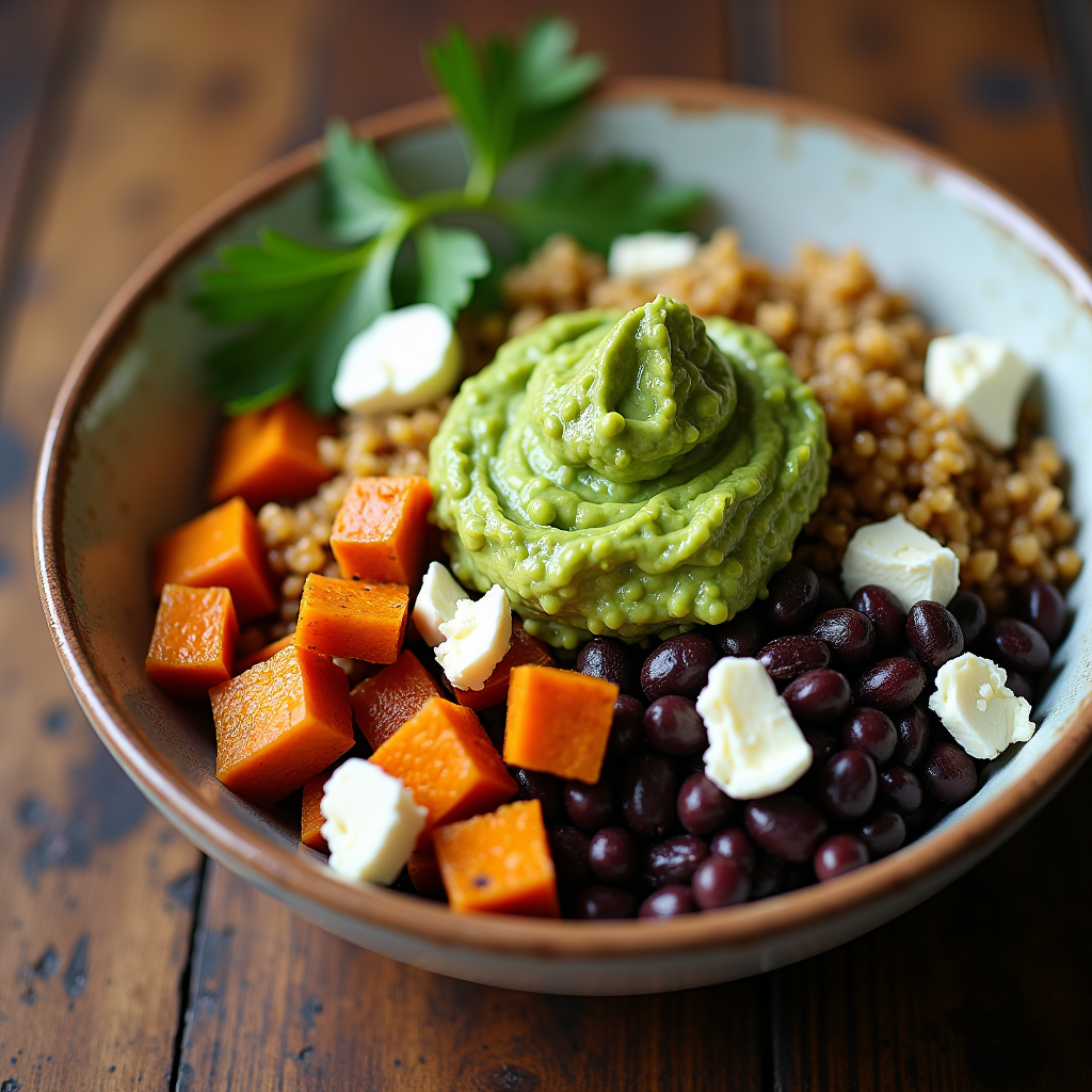 A vibrant bowl of quinoa, roasted sweet potatoes, black beans, and crumbled cotija cheese. Topped with a refreshing cilantro-lime vinaigrette and a dollop of fresh guacamole.
