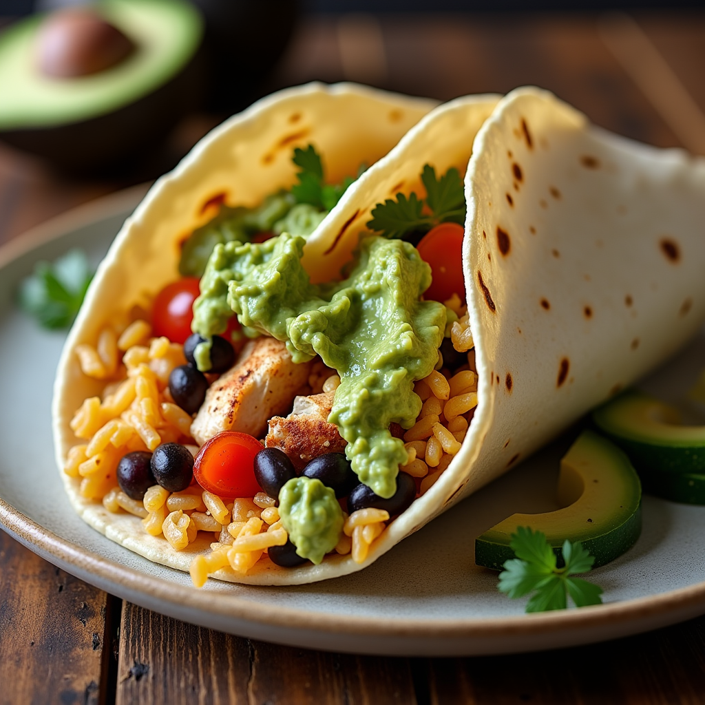 A large flour tortilla filled with seasoned rice, black beans, grilled chicken, pico de gallo, and a layer of crunchy tortilla strips all smothered in creamy guacamole.