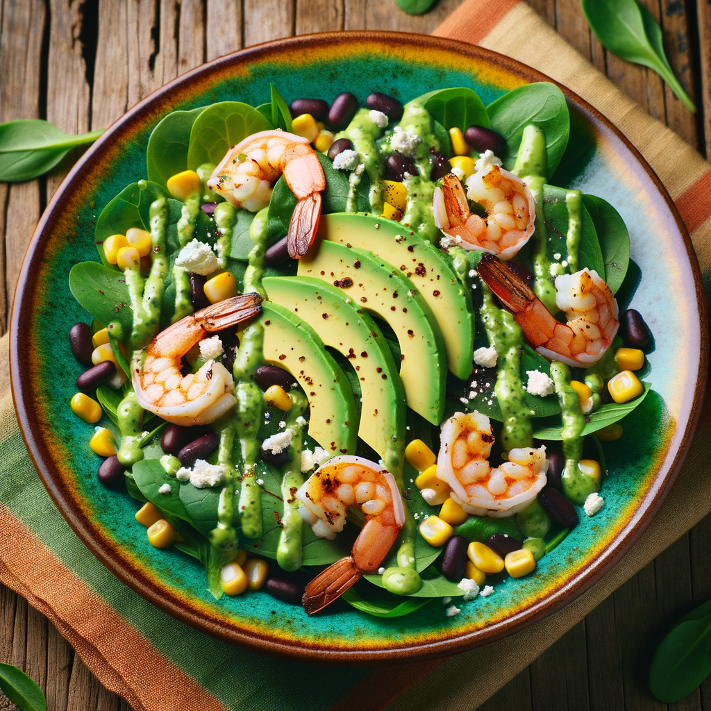 A fresh mix of greens tossed in avocado dressing, topped with succulent grilled shrimp, sliced avocado, sweet corn, black beans, and a sprinkle of cotija cheese.