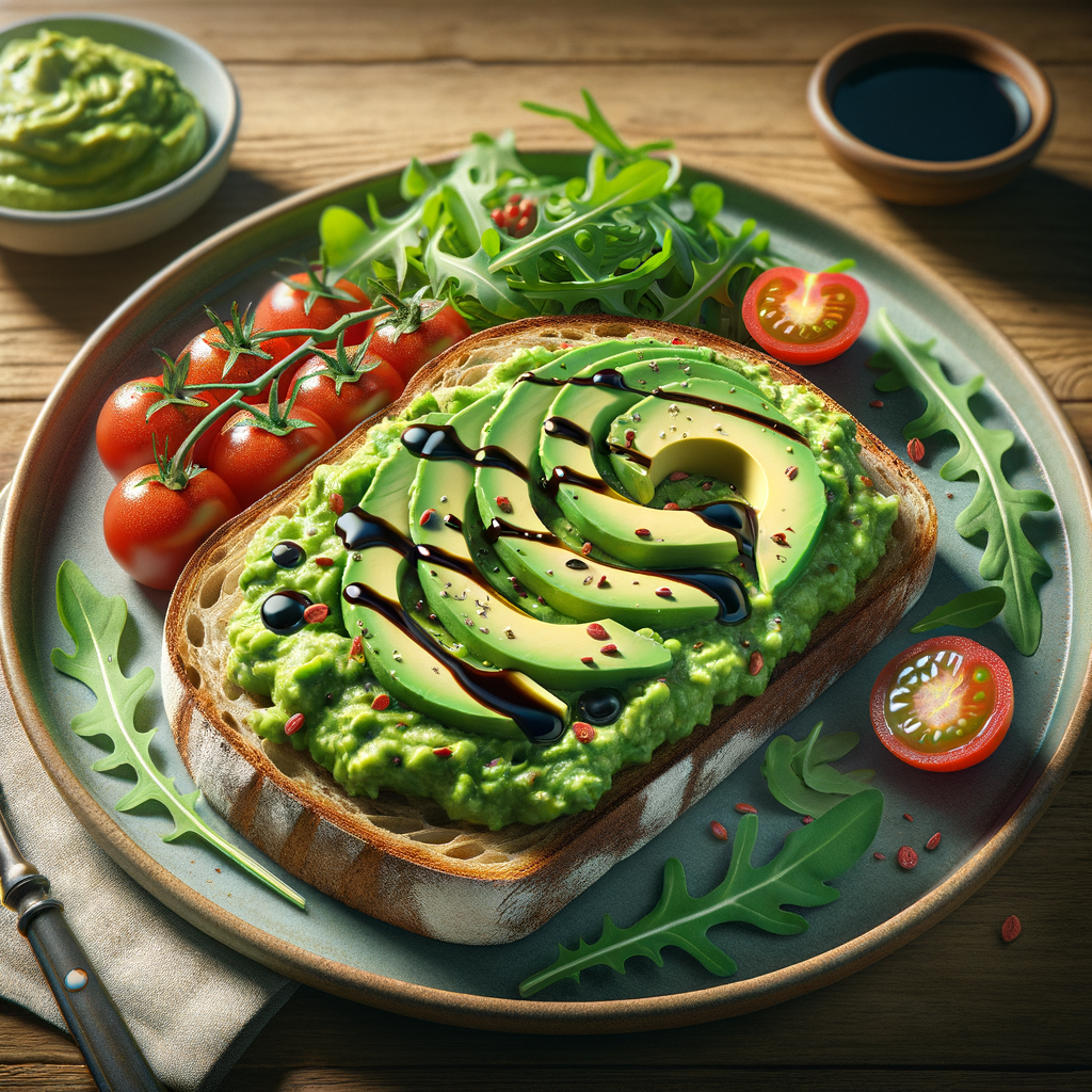 A thick slice of artisanal whole-grain bread topped with a generous layer of creamy mashed avocado, cherry tomatoes, arugula, and a drizzle of balsamic glaze, accompanied by a side of mixed greens.