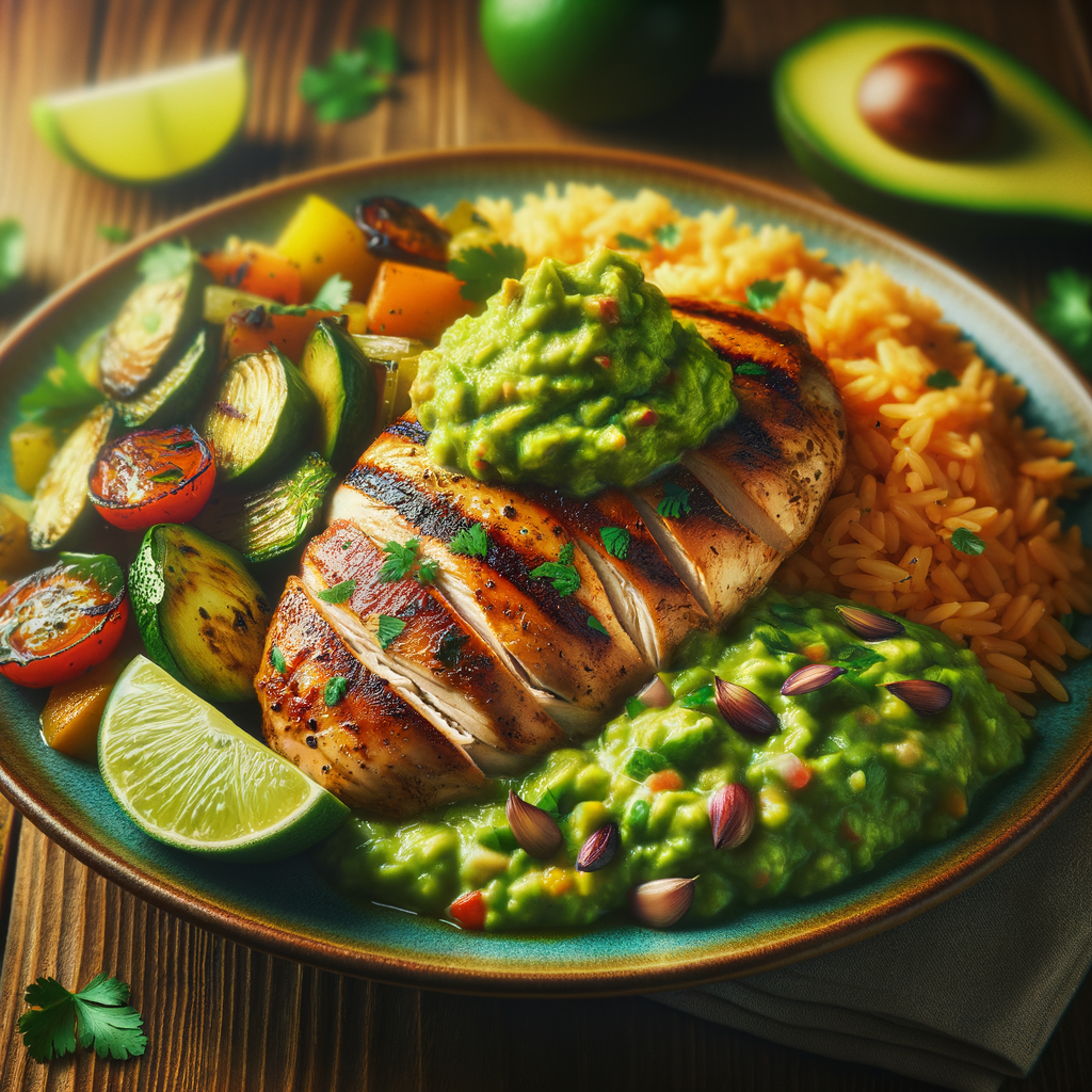 Juicy grilled chicken breast topped with a hearty dollop of classic guacamole, served with roasted vegetables and cilantro-lime rice.