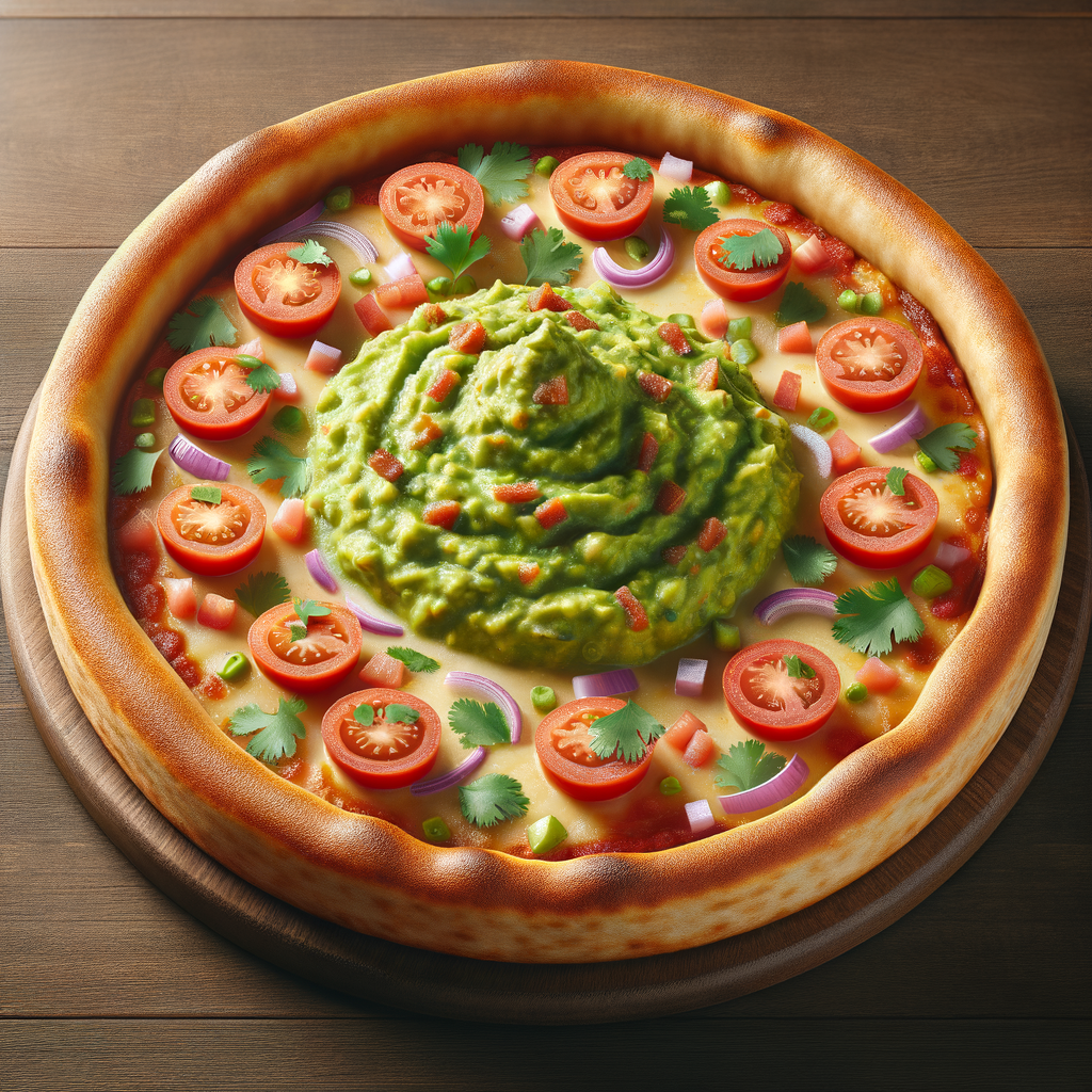 A deep-dish pizza with a twist, featuring a layer of creamy guacamole beneath a blend of melted mozzarella and cheddar cheeses, topped with diced tomatoes, red onions, and a sprinkle of cilantro. A fusion of Chicago tradition and avocado delight.