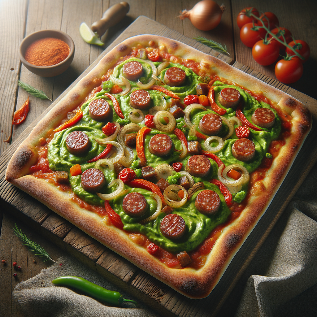 An oven-baked, thin-crust square pizza featuring a smooth avocado dressing base, topped with a medley of Italian sausage, roasted red peppers, and caramelized onions, creating a delightful blend of creamy and savory flavors.
