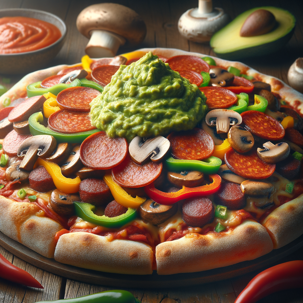 A stuffed pizza that layers savory sausage, pepperoni, mushrooms, and bell peppers between sheets of golden crust, with a generous dollop of guacamole on top, finished with a robust tomato sauce to tie all the flavors together.