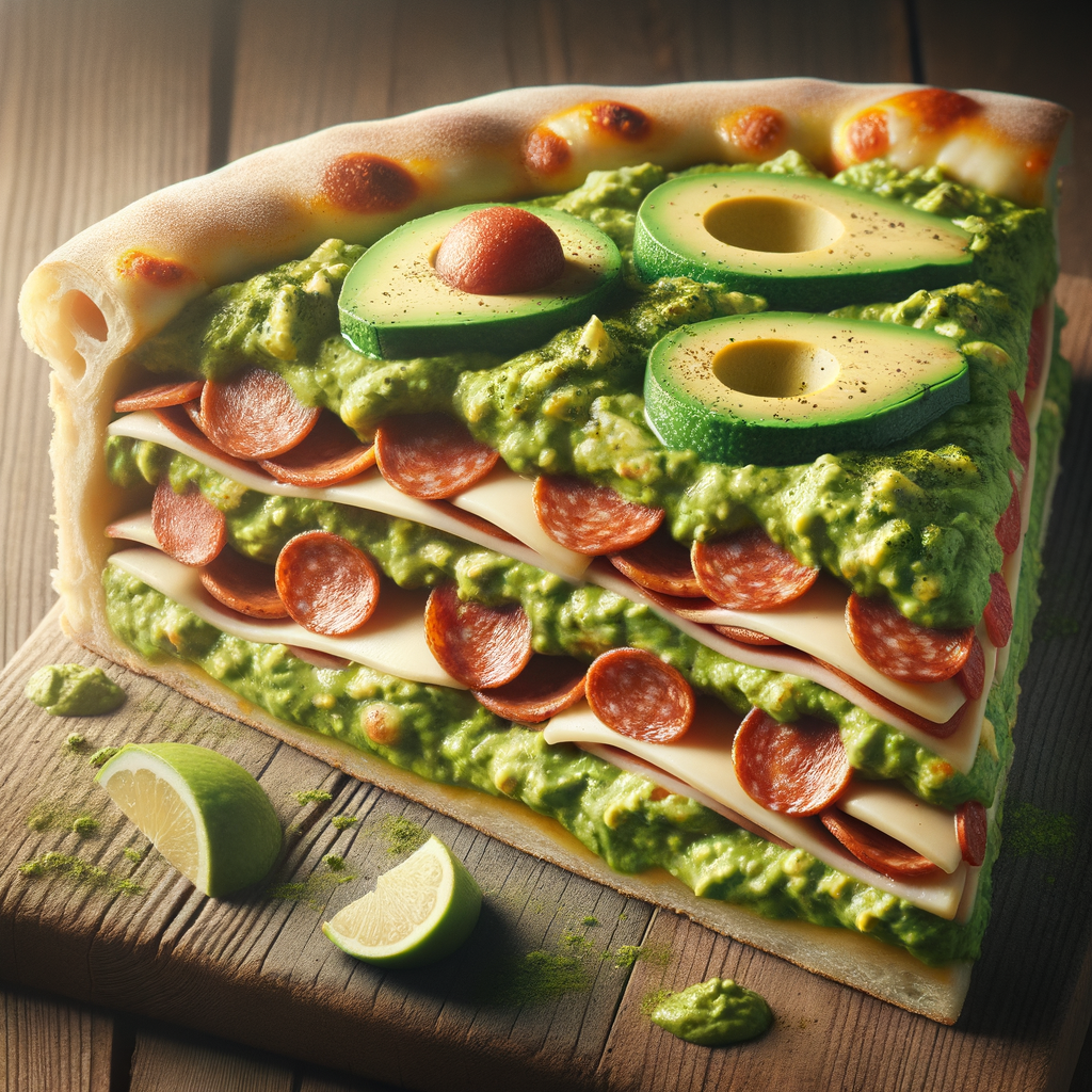This stuffed pizza starts with a double layer of dough, filled with layers of creamy guacamole, Italian sausage, pepperoni, and a blend of cheeses, baked to perfection and topped with a homemade garlicky avocado pesto sauce.