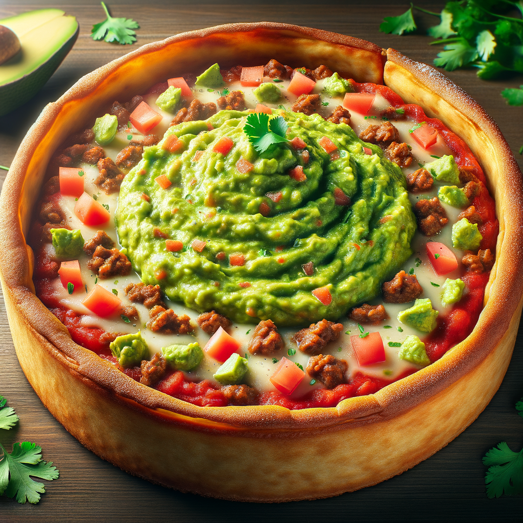 A Chicago-style deep-dish pizza with a buttery crust and a layer of zesty guacamole beneath mozzarella cheese, topped with chunky tomato sauce, seasoned ground beef, diced tomatoes, and a sprinkle of cilantro for a Mexican twist on an American classic.
