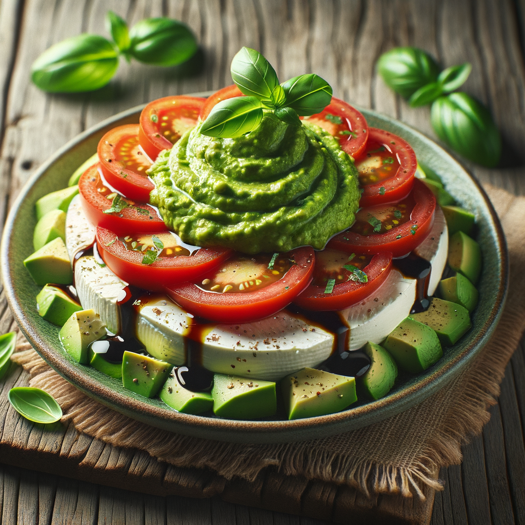 A refreshing Caprese salad reimagined with thick slices of fresh mozzarella and ripe tomatoes, layered with a generous dollop of creamy avocado mash, drizzled with a balsamic glaze, and sprinkled with fresh basil leaves for a burst of flavor.