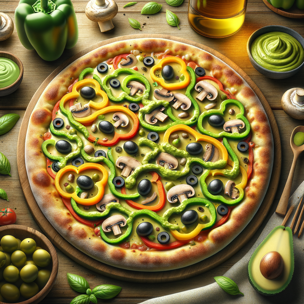 A thin-crust pizza loaded with fresh vegetables like bell peppers, mushrooms, and olives, all drizzled with a smooth avocado dressing for a refreshing finish.